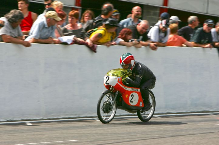 La seconde guerre s’oubliait à peine et toute l’industrie mécanique européenne revivait. La parade réservée aux Motos G.P. des années 50 et 60 sera le témoin de ce renouveau qui mis face à face pilotes d’usines et pilotes privés.