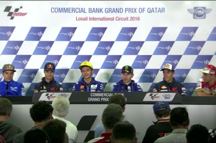 Une certaine tension était palpable avant cette première conférence de presse du Grand Prix du Qatar. Une bonne distance continue de séparer Rossi et Marquez, les deux acteurs principaux de la fin de saison passée. Bien évidemment, la question de leur rivalité fût posée aux deux pilotes. A cette question, Rossi répond avec philosophie que rien de spécial ne se passera sur la piste, tous les pilotes continueront à se battre pour être devant. Bien sûr il aurait souhaité que la dernière course se passe autrement, mais c’est du passé, et il est heureux de débuter cette nouvelle saison. Marquez élude plus ou moins la question, et déclare qu’il se battra de la même façon avec chacun de ses concurrents et qu’il utilisera son expérience acquise l’an passé afin d’atteindre son objectif: le titre mondial.