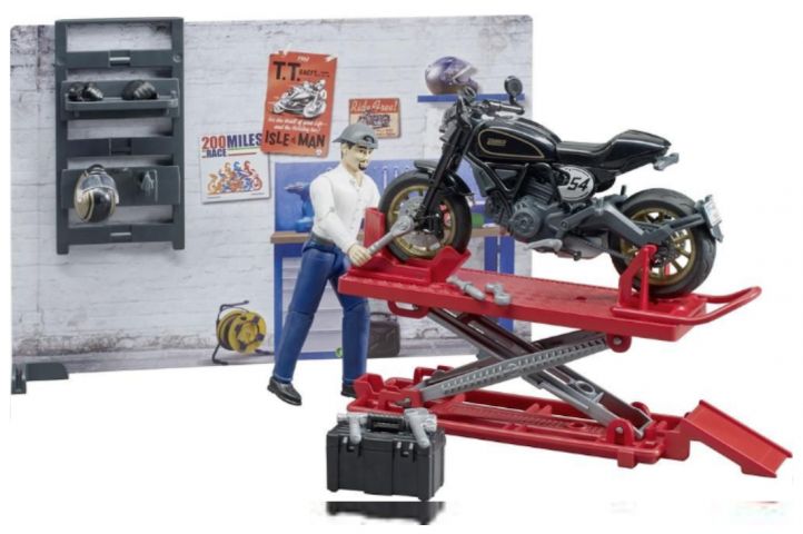 Dans son petit atelier, Bruder bricole sa Ducati Scrambler Café Racer! Pour mener sa mission à bien, Bruder s'est équipé de ses outils et d'un pont élévateur. Un moyen ludique et divertissant qui permettra à vos enfants de découvrir le monde fascinant de la moto tout en s'amusant. Et si vous êtes resté vous-même un grand enfant, cet atelier décorera votre bureau à merveille!
