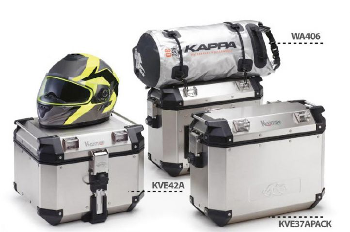 Les valises latérales KVE37APACK offrent chacune une capacité de 37 litres et 10 kg de charge. Quant au top-case KVE42A, il permet d'emporter encore 10 kg de charge supplémentaire avec son volume total de 42 litres. Un sac souple étanche en tarpaulin est aussi proposé.
