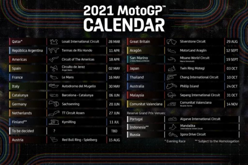 En marge du Grand Prix d'Europe, qui se dispute ce week-end sur le circuit Ricardo Tormo de Valencia, la Dorna a dévoilé le premier projet de calendrier pour la saison 2021.