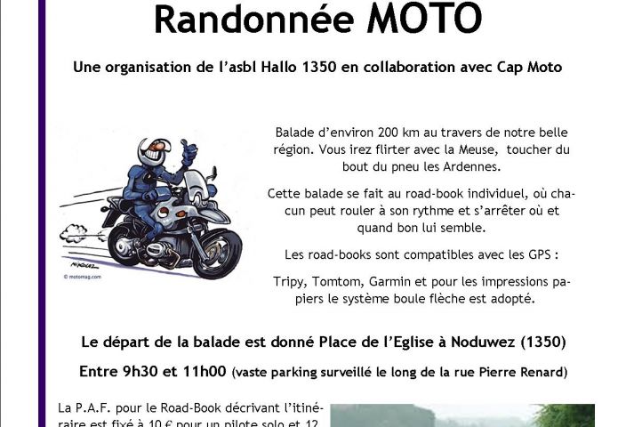 L’ASBL Hallo 1350 proposera en collaboration avec Cap Moto une randonnée d’environ 200km le samedi 19 septembre prochain.