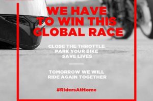 En utilisant les plateformes de réseaux sociaux de la FIM, "We, The Riders" ("Nous, les motards") et FIM-Live, la FIM souhaite appuyer le message mondial qui appelle une grande partie de l'humanité à "rester à la maison", au travers de sa propre campagne #RidersAtHome (Motard à la maison).