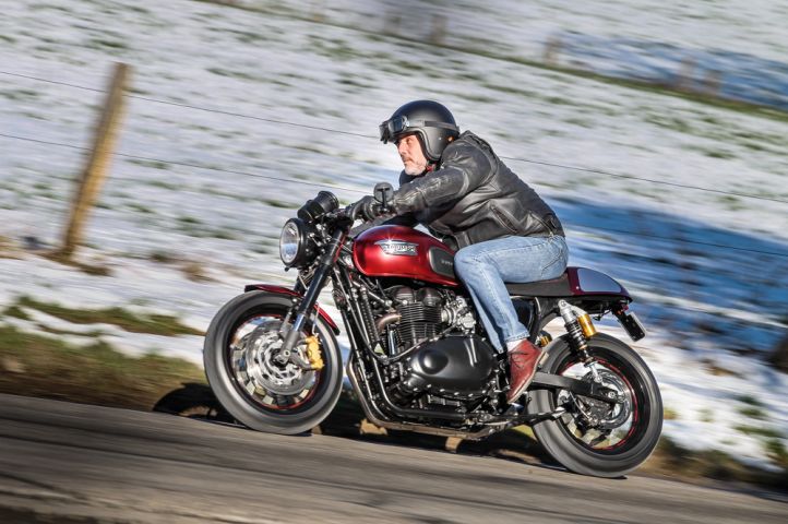 Assez parlé, il faut vraiment aller dérouiller les bielles de cette beauté. Dès la mise en marche, le twin se racle la gorge pour laisser échapper un son rauque, puissant, largement antisocial mais vachement bon. Pendant qu’elle chauffe gentiment sur sa béquille, on ne peut que profiter de cette «Cherry» dont la couleur est vraiment superbe au soleil. La position de conduite, un poil sur l’avant est tout à fait dans le ton d’un café racer, les commandes reculées tombent pile poil où il faut. Sur la position de conduite, rien à dire. Première, je démarre pour oublier directement la transmission. La courroie est presque la solution idéale sur une moto, c’est doux, sans à-coups et propre. Forcément, avec un tel train roulant, la Thruxton est transfigurée avec sa fourche de «street» et ses Öhlins. Ça ne bouge pas d’un poil, ça reste scotché au tarmac pourtant bien froid. Cette Triumph a un comportement transfiguré. Maintenant qu’elle est bien chaude, je pousse un peu et passe les rapports sans couper les gaz. La manœuvre s’accompagne d’un claquement tel un «shifter» pourtant absent. Le pied! Vraiment, cette moto est une vraie réussite. Ça pousse largement assez pour s’amuser, ça vire sur un rail, ça freine du tonnerre et quand on s’arrête, elle fait chavirer les cœurs. Il y a longtemps qu’une bécane ne m’avait pas fait cet effet!