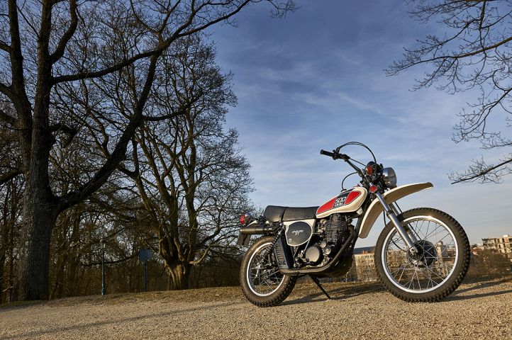 Apparue en 1976 et censée répondre aux productions anglaises telle la BSA 500 Goldstar, la Yamaha XT 500 fut le premier gros monocylindre 4T émanant de la production japonaise. Son apparence est simple et classe à la fois. Rien n’est superflu mais tout se trouve à sa place. Les coloris se révèlent particulièrement réussis avec le mélange du réservoir blanc et du magnifique moteur noir dont les ailettes du cylindre laissent apparaître leur tranche métallique. Le grand guidon et les garde-boues hauts donnent une irrésistible envie de prendre la clé des champs.