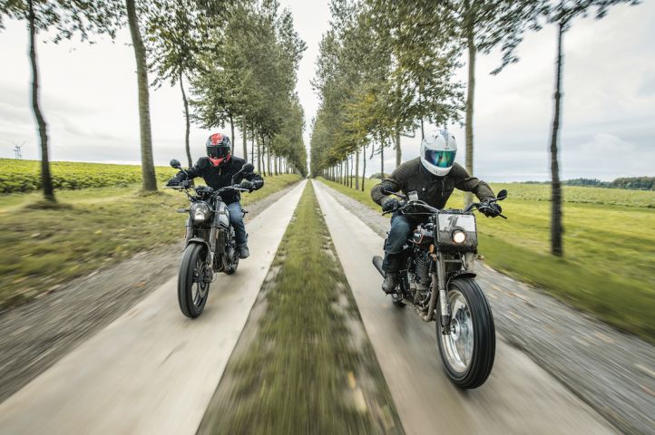 Cette dernière donne immédiatement le ton avec un démarrage plus laborieux du moteur à la sollicitation du bouton de démarreur, un moteur monocylindre à l’ancienne, rocailleux et râpeux face au twin de la Benelli, mais sacrément attachant malgré tout. En fait, c’est toute la moto qui est attachante, par sa gueule, son poids, son gabarit et sa hauteur de selle, son côté conduite vintage sur le gras du couple. On finit par s’habituer au dessin de son guidon et on s’y sent bien pour musarder.
