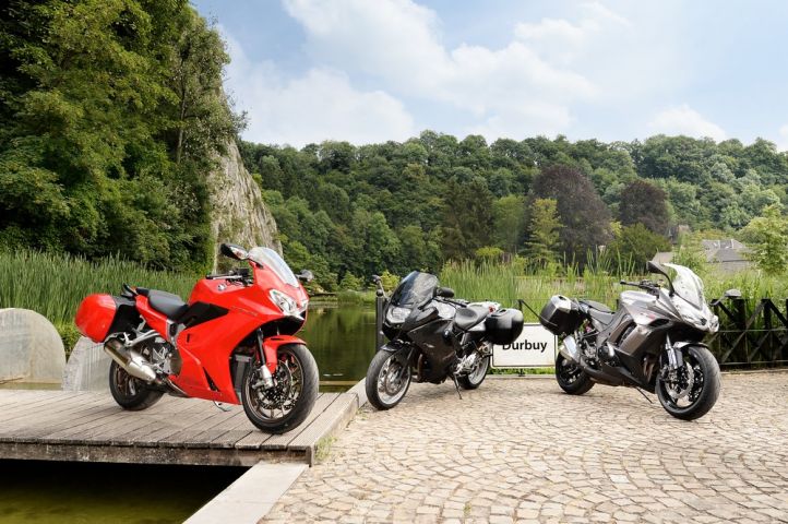 Pour vous offrir ce comparatif, nous nous sommes creusé les méninges. Pas facile, aujourd’hui, de trouver dans les catalogues des constructeurs de nouvelles (ou pas trop anciennes) GT Sportives. Vous savez, ces motos qui vous permettent de vous déplacer au quotidien, qui vous accompagnent en week-end et qui sont assez confortables pour prendre la poudre d’escampette lors des grandes vacances. Des motos sages, mais qui, de temps à autre, suivant votre bon vouloir et votre humeur, se réveillent sous l’impulsion de votre poignet droit et vous envoient une bonne bouffée d’adrénaline. Des trails (vrais ou faux), il y en a en pagaille. Des sportives, il en existe encore, fort heureusement. Mais des GT Sportives… nada! À croire que c’est une espèce en voie de disparition. La preuve: nous avons dû associer deux cylindrées – 800 et 1000cc – pour avoir trois machines à notre disposition. À la BMW F 800 GT, à la Honda VFR800F et à la Kawasaki Z1000SX, nous aurions pu aussi ajouter la Honda Deauville, mais on aurait encore eu une cylindrée supplémentaire, tandis que la Triumph Sprint ST est, avouons-le, en fin de carrière. D’ailleurs, elle n’était plus disponible auprès de l’importateur de la marque. Signe que la relève se prépare chez Triumph… Au départ, nous voulions aussi rester dans des tarifs homogènes, mais cela s’est avéré tout aussi laborieux. La Kawasaki de notre essai peut déjà crever certains budgets et la présence de la Triumph n’aurait fait que creuser la différence. Que dire alors des moteurs? Ici aussi, pas moyen de dégotter des machines à mécanique identique. Nous voilà donc avec un bicylindre, un 4 en V et un 4 en ligne. Mais finalement, tout bien réfléchi, ce n’est pas plus mal. Sans doute hétéroclite, ce comparo vous permettra de choisir laquelle de ces GT Sportives vous convient le mieux pour vous évader.