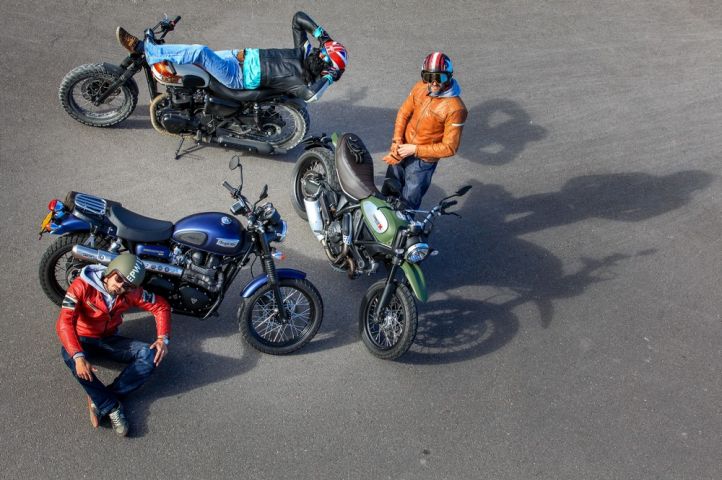 La scène des motos classiques est en pleine ébullition, on ne compte plus les motards qui décident de rouler vintage. Cependant, il importe de distinguer deux grands clans: d’un côté les adeptes de l’authenticité, des machines d’époque et de la clé de 13’’; de l’autre les nouveaux jeunes barbus sensibles à un univers iconique et looké que leur (re)vendent les constructeurs. Soucieux de leur image et d’un style de vie décalé, ils multiplient les accessoires et fringues les plus valorisants – et chers –, tant qu’il s’agit de cuir épais et de métaux nobles. Ces hipsters préfèrent trainer en ville, d’adresses branchées en adresses branchées, fréquenter les événements et meetings qui leur semblent de plus en plus consacrés. Un emploi du temps (libre) qui exclut les séances de mécanique interminables, à l’ombre d’un garage poussiéreux. Le temps d’un minitrip, nous nous sommes glissés sous la barbe de ces nouveaux motards au guidon de trois modèles emblématiques de la tendance vintage: la nouvelle Ducati Scrambler, la mère anglaise des néo-rétros, la Triumph Bonneville et sa copie qui a su se faire un nom, la Kawasaki W800. À moto, comme dans un film…