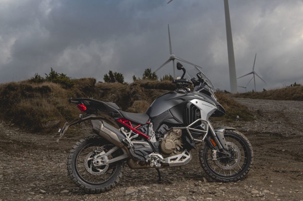 Jeudi 12 novembre. Je débarque au Ducati Store de Bologne. Généralement, pour ces présentations, on a droit à un long briefing technique agrémenté d’un laïus des responsables de la com’. Cette fois, rien de tout cela. Seulement quelques rapides explications sur les fonctions électroniques. Avant de prendre la route, pas même de café. J’en aurais bien eu besoin pourtant après avoir fait la route, hier, en voiture depuis la Belgique. Mais avec le protocole sanitaire, même ça, c’est interdit. Avant d’enfoncer le bouton du démarreur, je prends le temps de parcourir rapidement tous les menus. Comme Triumph, Ducati a choisi d’équiper sa Multistrada V4 d’un petit joystick. La commande se révèle un peu trop éloignée pour la contrôler facilement à l’aide du pouce. Mais bon, cette commande est plus facile et plus intuitive que dans mes souvenirs sur la 1200/1260. Le bouton de démarrage s’avère aussi un peu plus ergonomique. Seule version que je pourrai essayer aujourd’hui, la V4 S semble un peu hésitante au démarrage. Au ralenti également, elle n’a pas trop l’air d’avoir envie de prendre la route. Ah, mais c’est vrai: au ralenti, les cylindres postérieurs sont désactivés. Une histoire d’émissions. Et surtout de montée en température. Dès que l’on enclenche la première, cette nouvelle Multistrada tourne bien sur ses quatre cylindres. Et l’impression de flou laissée par l’accélérateur disparaît instantanément. En mode Urban, elle se montre directement très à l’aise et facile à mener. Souvent, dans ce genre de mode, les motos sont tellement «étranglées» que j’opte tout de suite pour un autre programme. Ici, la Multistrada est très agréable. Bien plus que ses devancières. Je me rappelle du jour où, avec la première 1200 Multistrada, j’ai ouvert les gaz en grand. Mon séant s’en souvient encore. J’ai toujours trouvé que les 1200 et 1260 étaient brutales. Bien trop brutales. Rien de tout cela avec la V4 qui, malgré ses 170ch – ou plutôt grâce justement à cette puissance –, réagit toujours avec vigueur mais de manière naturelle aux sollicitations du poignet droit. D’emblée, cette V4 S apparaît aussi très maniable. Les changements de direction sont immédiats. L’idéal pour éviter ces Fiat 500 slalomant dans la circulation matinale de Bologne. Un comportement très neutre, et parfaitement prévisible. On en oublierait sa roue avant de 19 pouces.