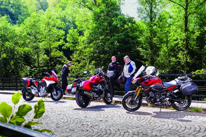 Elles, ce sont les trois dernières routières «trailisantes» à caractère sportif. Un tempérament à peine voilé pour Honda, totalement assumé pour MV Agusta et hautement revendiqué pour Yamaha. Afin de vérifier ce qu'elles ont dans le ventre, nous les avons équipées de leurs valises pour mettre le cap vers Houffalize et ses vertes hauteurs.