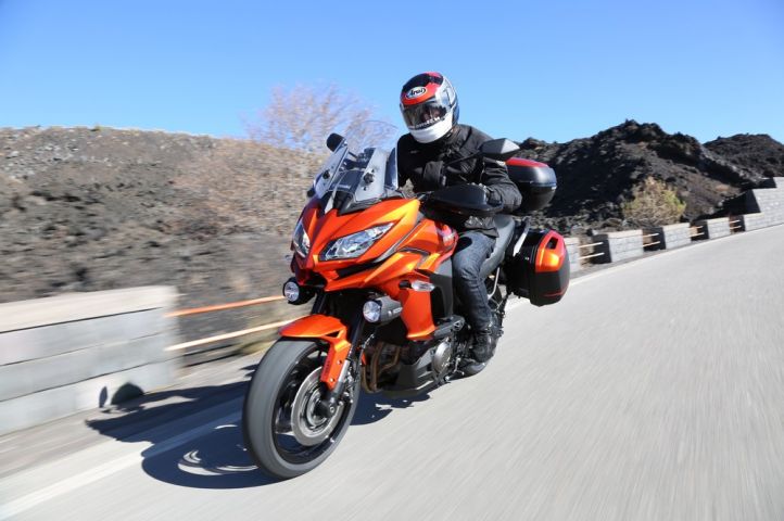 Niveau confort, c’est vraiment bon, comme sur la 650. Seule la bulle génère de manière très surprenante bien plus de turbulences sur le casque, et donc de bruit. Et en position haute, pas d’amélioration. Sa plage de réglage de 75mm a pourtant été élargie de 4cm… L’effet global du design de la face avant, sans doute. Bulle haute à prévoir en option si vous mesurez 1m80! En duo, un bon 15cm séparent pilote et passager. De quoi voyager très relax. Par contre, pour monter et descendre sur la selle arrière, avec les valises, une bonne souplesse des jambes sera requise. Pour le conducteur, toujours pas de de selle modulable. Mais avec 840mm (-5mm), on culmine heureusement à la même hauteur que sur la 650. Si la petite sœur proposait un tableau de bord à deux étages, compte-tours au-dessus et écran digital en dessous, sur la 1000, on retrouve tout ce qu’il faut, avec une présentation plus classique. À gauche, le compte-tours à aiguille et à droite, un écran digital avec jauge essence, vitesse, indicateurs du mapping et du contrôle de traction, ainsi qu’un témoin de conduite économique. Un premier bouton permet, en outre, d’afficher soit la température de l’air, soit la température moteur et un second vous fait voyager entre l’horloge, l’odomètre, deux trips, la conso instantanée, la conso moyenne et l’autonomie restante. Tant qu’à parler d’autonomie, la 1000 s’est contentée de 5,50l sur un parcours beaucoup plus roulant que la veille. Vu qu’elle dispose du même réservoir de 21l, l’autonomie reste très intéressante. Avec un top-case de 47l et des valises de 28l chacune, vous serez parés pour aller loin. Très loin. Surtout que la Versys 1000, si elle peut se conduire dans les tours avec le cœur comme on le fait sur un roadster, joue quand même prioritairement la carte du confort avec un amortissement plus souple et de nouveaux réglages de ressorts additionnels. Le train avant reste précis mais la remontée d’information n’est pas aussi nette que sur, par exemple, une Z800 ou une Z1000. Si la fourche pompe en courbe suite à une compression ou si l’on serre les freins trop tard en entrée de virage, le feeling se dilue un peu. Par contre, on roule en permanence dans du beurre. Au final, un excellent compromis pour un tourisme suffisamment sportif. Enfin, pour acquérir la Versys 1000, votre portefeuille devra s’alléger de près 5.000€ supplémentaires. 12.599€, c’est son prix. Cela reste concurrentiel dans son segment mais le tarif est beaucoup moins serré que celui de la 650.
