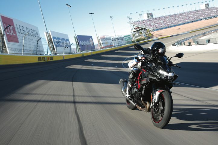 Nous sommes dans le Nevada et notre essai sera divisé en trois parties. Sur le speedway de Las Vegas, nous aurons droit à plusieurs sessions sur un petit circuit tracé à l’intérieur de ce vaste complexe. Ensuite viendra le temps fort de ce test: nous emprunterons l’anneau de vitesse réservé d’ordinaire à la série automobile Nascar. Nous aurons ensuite l'opportunité d’essayer cette nouvelle Kawa dans l’arrière-pays pour un petit ride d’un peu moins de 200km à travers les réserves naturelles de la Fire Valley.