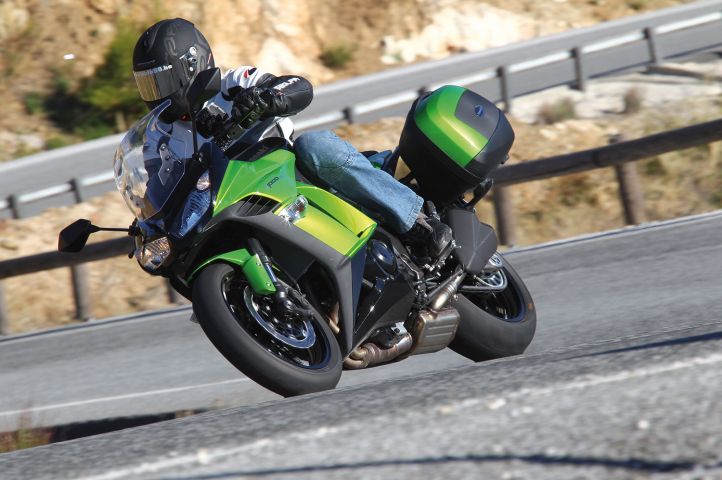 La route s’ouvre sur une belle trois voies au revêtement parfait. Quel que soit le régime de sollicitation des gaz, le moteur répond avec vigueur et «emmène» très fort. La puissance se libère de manière relativement linéaire, mais on perçoit une montée en régime plus rapide à partir de 7.000tr/min. Le rythme s’accélère et la machine se transforme peu à peu en chasseuse de chrono. Les trajectoires se tendent, la SX plonge avec délectation au point de corde sans broncher. Bien posée sur ses pneus, la Kawasaki prend de l’angle jusqu’au pose-pieds sans jamais broncher. A cette allure, elle est vraiment impériale et se calque tout à fait sur le «feeling» de sa sœur roadster, la Z1000. Cette machine est d’une efficacité redoutable. Les vitesses atteintes sont très vite au-delà du raisonnable. Les virages vous sautent au visage et les excellents freins vous poussent à retarder le moment où vous vous décidez à les actionner. Là, vous rentrez sur les freins et la machine reste imperturbable. La boîte de vitesses suit le mouvement et dès le deuxième rapport, les vitesses passent à la volée sans aucun à-coup. Nous voilà assez loin d’un essai d’une machine de «tourisme» tant la tentation est forte d’ouvrir «en grand» avec cette moto. On peut quand même mettre un bémol au comportement quand, en passant d’une version sans les valises à une autre équipée de celles-ci, on constate un flou de l’arrière sur des freinages « appuyés » et à partir de hautes (très hautes…) vitesses.