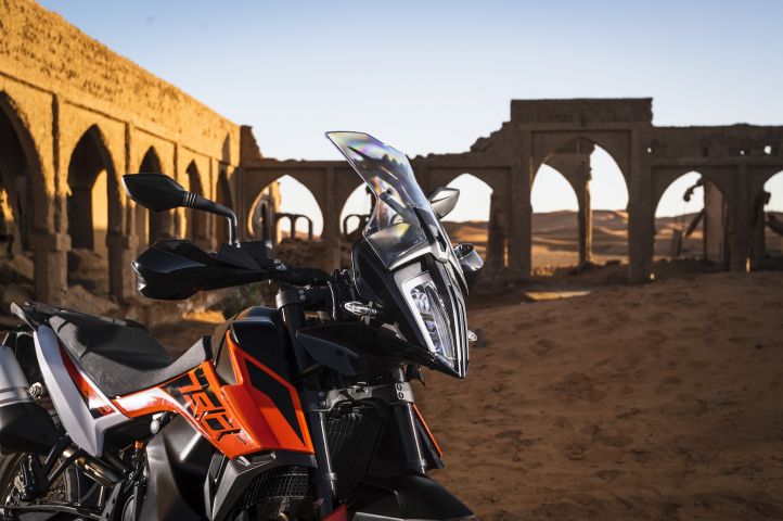 Chose assez rare lors d’une présentation, nous avons droit à deux jours d’essais. Le premier est consacré à l’Adventure et à la partie routière. Seulement voilà, nous essuyons une tempête de sable, le vent violent limite la visibilité. En conséquence, KTM modifie le programme et réduit la boucle initialement prévue. Cette prise en main écourtée nous permet malgré tout de découvrir une moto très agréable et sur laquelle on est bien installé, avec une selle accueillante et un guidon qui tombe bien en mains. À l’abri derrière la petite bulle en plexi, on a tout le loisir de détailler le bel écran qui regorge d’informations.