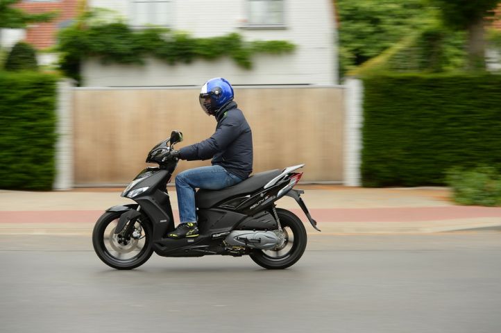 L’espace du poste de conduite a également été repensé. La selle, plus basse de 4cm, permet à tout un chacun de poser les pieds au sol. Des pieds qui profiteront également des échancrures à l’avant d’un plancher pour trouver leurs aises, à l’image de genoux nullement gênés par le tablier. Grâce au crochet d’arrimage, on pourra même fixer un petit sac, à moins de préférer le déposer sur le plancher plat. À propos de tablier, si, comme le petit saute vent, il propose une protection aux intempéries limitée, sachez qu’il inclut un vide-poche fermant à clef, à l’intérieur duquel vous trouverez une prise 12V pour recharger les multiples sources de communication de notre vie moderne. C’est aussi de ce tablier qu’émerge le bouchon d’un réservoir de 7 litres placé sous vos pieds. Une capacité qui vous permettra de parcourir environ 175km avant de passer à la pompe, l’Agility 125, avec une moyenne de 4l/100km n’étant pas le moins gourmand de sa catégorie. Surtout si vous emportez un passager. Celui-ci profitera d’une belle assise, de deux poignées incluses au porte-bagages pour se maintenir mais aussi de repose-pieds en alu qui émergeront du plancher par simple pression. Belle astuce mais dommage qu’ils soient un rien glissants. Le guidon, ni étroit ni trop large, tombe bien en main et le tableau de bord est simple, lisible et suffisamment complet. On y trouve une jauge à essence assez précise, une montre, un kilométrique à aiguille et, inclus dans un écran digital rétro éclairé, un totalisateur avec partiel.