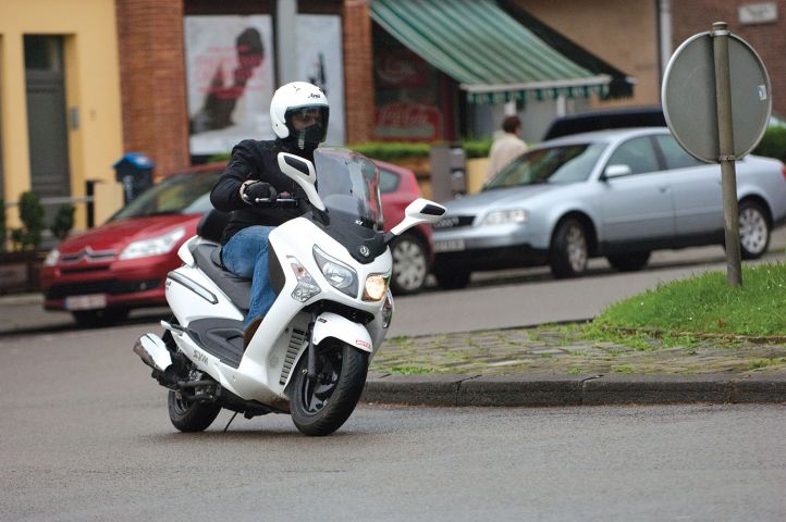 Le premier contact avec ce SYM est on ne peut plus aisé: selle culminant à une altitude raisonnable, position de conduite agréable (possibilité d'allonger confortablement les jambes) même si certains, dont nous sommes, trouvent le guidon un poil haut. Mais là on chipote… Globalement, on est donc très bien installé, surtout que la bulle fournira une protection honorable à la majorité des utilisateurs. Voyons maintenant ce que scooter a dans le sac… Sans être ébouriffantes, les accélérations du petit mono 4T injection sont très suffisantes en ville, et surtout très linéaires, sans trou aucun, même sur les premiers mètres. Certes, des scoots plus légers se montent plus vifs au démarrage, mais, dans l'ensemble, les perfs de ce 125i Evo ne souffrent pas la critique. Les choses se corsent sur voie rapide où il est assez difficile de dépasser les 110km/h (et encore, au compteur), ce qui est un poil juste pour affronter sereinement la circulation du Ring de Bruxelles, par exemple. Signalons au passage qu’à cette vitesse, l'aiguille du compte-tours est franchement dans la zone rouge, qui débute à 9.000tr/min. Voilà qui laisse perplexe, surtout qu'en descente le moteur accepte de grimper à 10.000tr/min sans rechigner, avant l'intervention du rupteur… Alors, de deux choses l'une: soit le compte-tours raconte n'importe quoi et il gagnerait à être remplacé par une médaille de Saint-Christophe, soit la démultiplication finale est trop courte, ce qui, à terme, risque d'être préjudiciable à la longévité mécanique. Nous penchons pour la première solution…