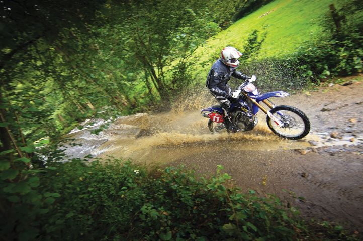 Pourtant, déjà, je constate que la Yamaha est en effet très compacte et ramassée, les commandes sont douces mais également fort efficaces, aucun jeu et des verrouillages francs lors de la sélection. Le freinage est parfaitement dosable mais plus puissant que l'origine. Après la séance de prise d'images, je peux enfin emmener la jolie bleue sur un parcours purement enduro que je connais bien et qui alterne chemins rapides, sentiers sinueux et glissants, grandes zones empierrées et franchissements plus techniques. Une chose se confirme et me rassure: la facilité surprenante de cette WRF: le moteur est puissant, mais il distille une motricité exemplaire et il est très aisé d'aller vite sans se faire peur, les grands «coups de raquette» ne sont pas au programme. Et pourtant le moteur est vif et répond même sèchement à la poignée des gaz. Lors des évolutions à basse vitesse on pourrait craindre que cette vivacité déséquilibre la moto mais il n'en est rien. En fait, la 450 WRF dispose d'un caractère moteur qui n'est pas sans rappeler un deux temps! Il faut noter aussi que cette 450 (toujours à carbu, rappelons-le) peut se targuer de réglages de carburation impeccables et éliminant toute hésitation à la remise de gaz. Les vibrations sont aussi quasi inexistantes.