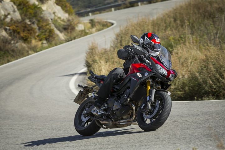 Un simple coup d’œil aux chiffres du marché européen suffit pour constater que Yamaha a tapé dans le mille avec sa MT-09. 12.000 unités écoulées entre septembre 2013 et août 2014 (dont 15% de Street Rally et de Sport Tracker), une place de leader incontestée dans le segment des roadsters de moyenne cylindrée et, entre janvier et octobre 2014, la 3e place au niveau des ventes toutes motos confondues (derrière la BMW R 1200 GS… et la MT-07!). Sur base de ce concept mêlant émotion et accessibilité, il était donc temps pour Yamaha de développer de nouvelles aptitudes au tourisme dynamique, sans renier l’ADN MT. Conserver un poids modéré de la performance et de l’agilité était donc obligatoire. C’est en ce sens que le moteur CP3 de 847cc à calage à 120° est inchangé. Il délivre toujours 115ch à 10.000tr/min et 87,5Nm à 8.500tr/min mais ses 3 cartographies (D-Mode) ont néanmoins été repensées tout spécialement pour la Tracer. On note également l’arrivée d’un contrôle de traction entièrement commutable et, enfin, le cadre en aluminium coulé sous pression est, lui aussi, inchangé. La boucle arrière a, par contre, été allongée de 130mm et renforcée afin de soutenir le supplément de poids dû à la bagagerie. Restait à voir comment ajouter de la versatilité à l’ensemble. La fourche inversée de 41mm – réglable en précharge et en détente – dispose désormais d’un débattement de 137mm pendant que la suspension arrière Monocross peut, elle, compter sur un débattement de 130mm et se régler en précharge et en détente. Au final, la répartition des poids ne change pas par rapport à la MT09: 51% sur l’avant, 49% sur l’arrière, pour un poids en légère hausse (vu le carénage, les nouveaux équipements, la boucle arrière plus longue…) de 190kg à sec. Et pour s’adpater à cette nouvelle masse, les réglages en ressort et en hydraulique ont été légèrement durcis.